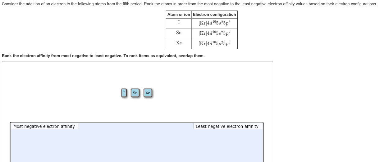 And that's because so does the nuclear charge the effect of nuclear charge. Arrange the following elements from greatest to least tendency to accept an electron. To rank items as equivalent, overlap them answer: