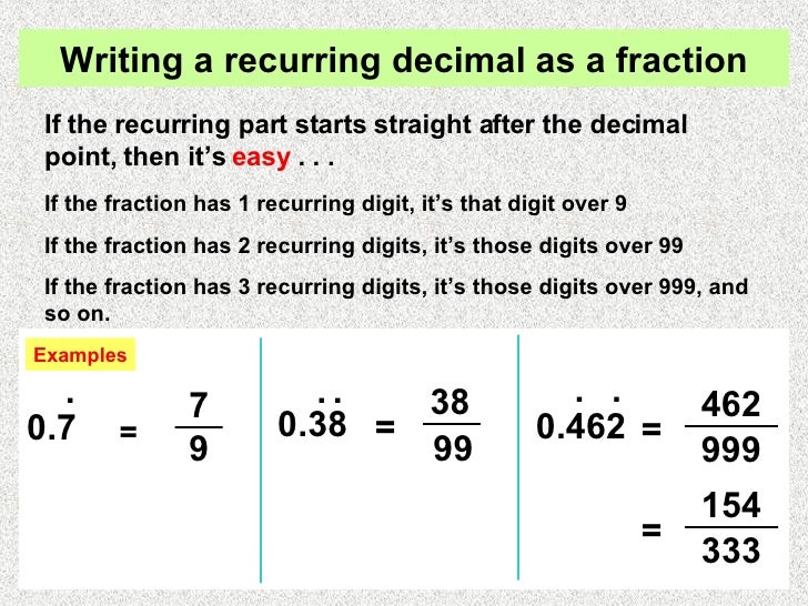 Steps to convert 0.038 into a fraction. Notice that there are 2 digitss in the repeating block (38), so multiply both sides by 1 followed by 2 zeros, i.e., by 100. (reduced) fractional number equivalent of 0.38 is 19.