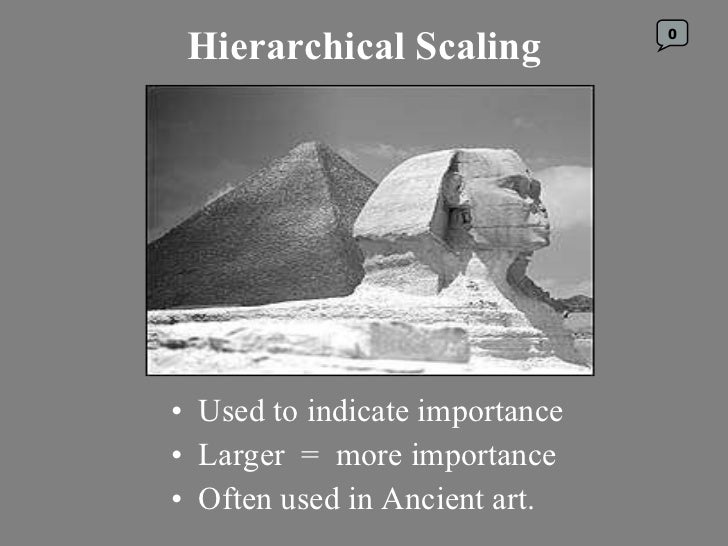 Significant or important individuals, such as pharaohs, were depicted as being much larger than any figures in a scene. Scale can refer to any relationship of parts to the whole, but one particular type is of great significance in many periods: Hierarchical proportion is a technique used in art, mostly in sculpture and painting, in which the artist uses unnatural proportion or scale to depict the relative importance of the figures in the artwork.